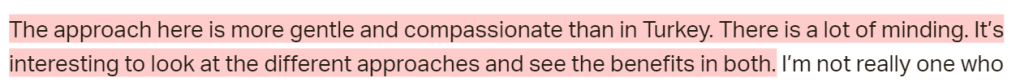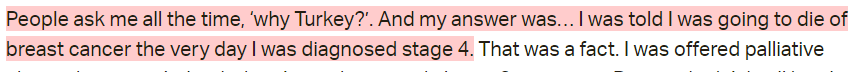 She seems to explain that her reason for choosing to go to Turkey was almost out of desperation. She was told she was going to die and she didn’t want to accept the palliative option. She weighed her options at the time and she was led to believe that this clinic was a promising one. She was now back home for treatment, trying to find an oncologist that was suitable for her.