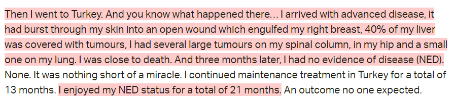 It is with great sadness that I have found out that some of those who have received treatment for the clinic in Turkey have actually had disease progression and have passed away. The website does not disclose this at all and some of the testimonials are still on the website. This has been a major issue in the past as well. This sad, sad reality should be addressed since there are advocates who still promote the clinic and tout their “results”.