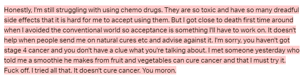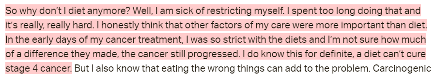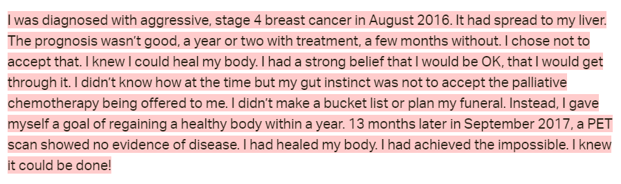 Understandably, she writes in a slightly frustrated tone after this. She thought and was led to believe that she was doing everything right. She followed the plan to “find the root cause and eliminate it.” But despite this, her cancer came back.