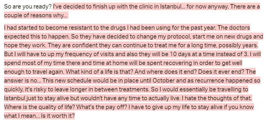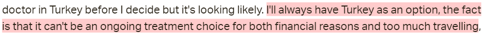 She does keep the Turkey clinic in mind as an option, however, the clinic is not sustainable as it is too expensive and traveling is too taxing. This has been common in other patients too.