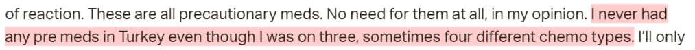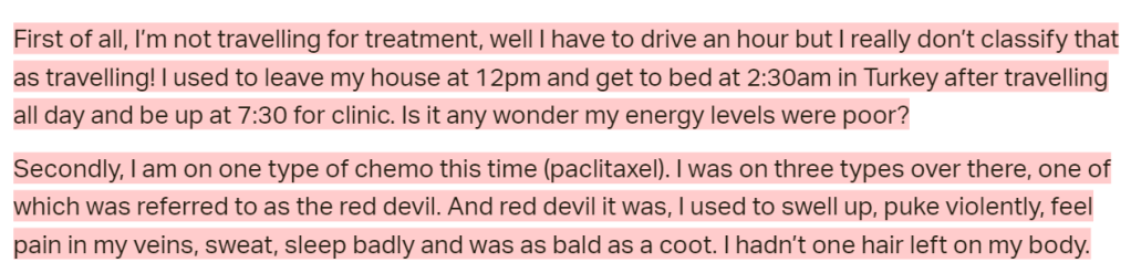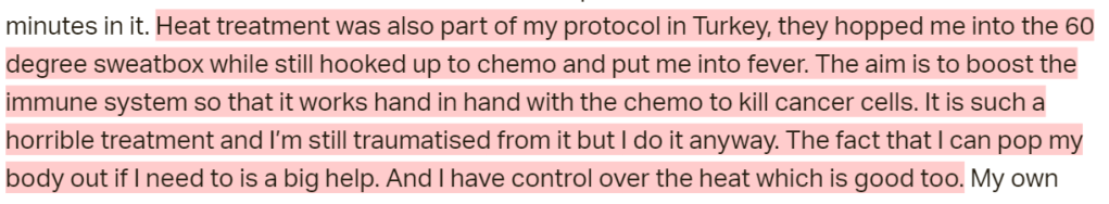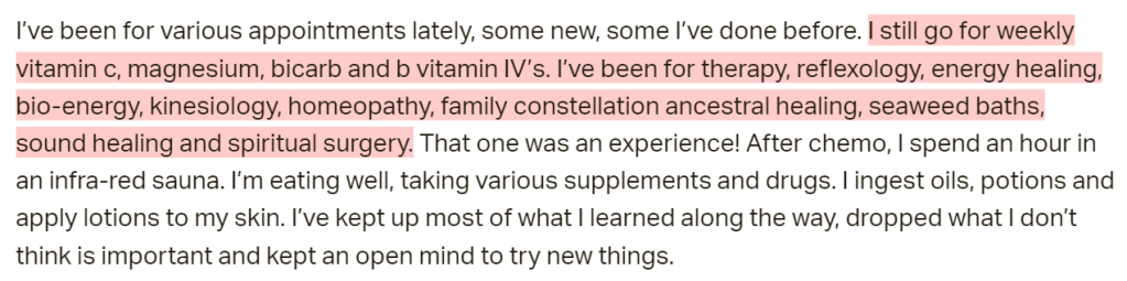 This patient went to ChemoThermia and was an advocate for the clinic. However, her tone towards the clinic has change slightly over time – this has been interesting. This patient continued to use unproven Complementary and Alternative (CAM) therapies though, despite writing discouragingly about the clinic at times.