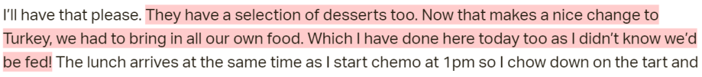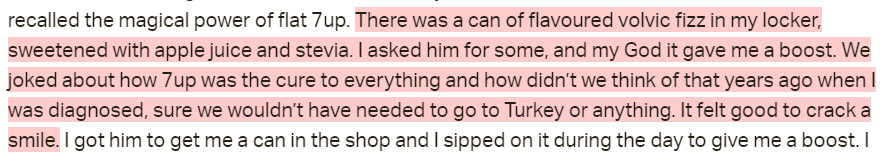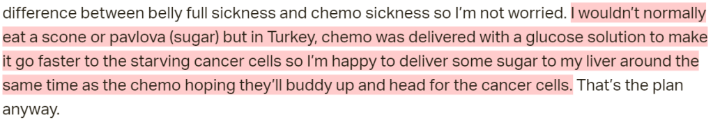 She does seem to joke about drinking a sugary beverage. 7UP gave her a boost. Perhaps she didn’t think of the drink when she was originally diagnosed because of the anti-sugar narrative propagated in the clinic in Turkey? They joked that 7UP was now the cure to everything, this allowed her to crack a smile. I am happy for her.