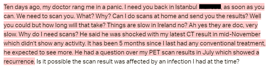 She went to Turkey and got the scan. Those results are unreported. She did post her CT scan results – “No definite residual metastases. Lung nodules are almost certainly benign. Bone metastases show therapeutic response.” Another update was not posted until 2019, I do not believe she ever posted those scan results from Turkey.