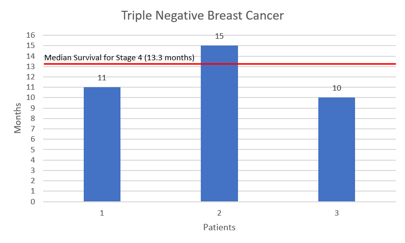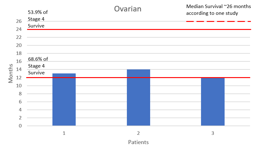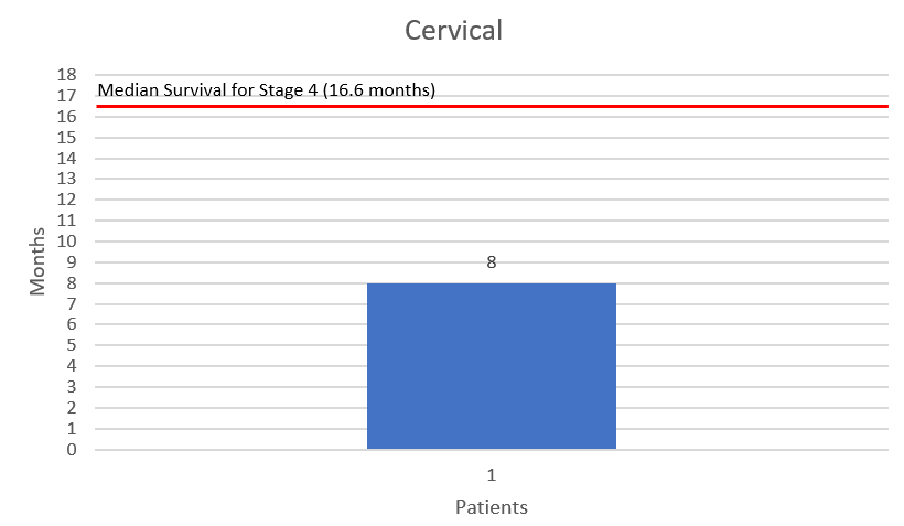 Furthermore, the survival data becomes even less staggering when we look at median survival rates using standard treatments. Some of the ChemoThermia patient’s survival no better or even less than the typical median survival rates. ChemoThermia patient survival in months is compared to typical median survival below for Ovarian, Triple Negative Breast and Cervical cancers.