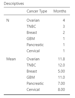 For now, for simplicity sake, if we take the month that each patient started treatment at ChemoThermia as well as the month that they died and round that date to the first of each month, the mean survival time out of these 11 patients was ~10 months. Although this wouldn’t be very accurate since we cannot lump different cancer types all into one group.