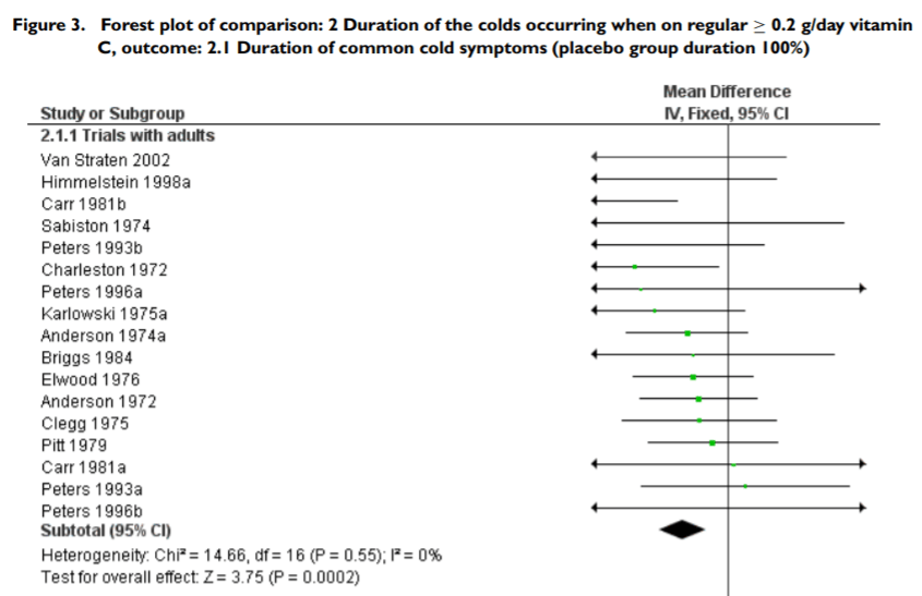 By looking at the forest plot this study helped shift the effect to favor Vitamin C for cold duration in adults. However, the common cold data is self-reported and they even conclude that “there was no effect of vitamin C in preventing colds.” The placebo was even said to be effective, but keep in mind that these were subjective feelings.