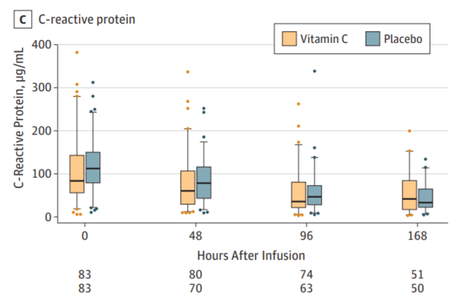 - “In this preliminary study of patients with sepsis and ARDS, a 96-hour infusion of vitamin C compared with placebo did not significantly improve organ dysfunction scores or alter markers of inflammation and vascular injury.”