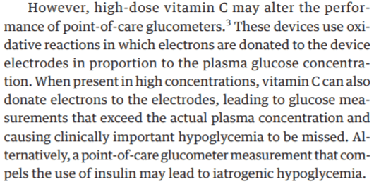 - There is also some concern about high-dose vitamin C altering the performance of point-of-care glucometers, “leading to glucose measurements that exceed the actual plasma concentration and causing clinically important hypoglycemia to be missed.”