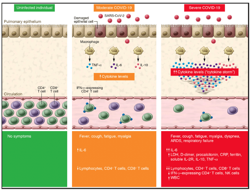 One noticeable feature of the “cytokine storm”, that is characteristic of mild to severe COVID-19, is an increase in IL-6.