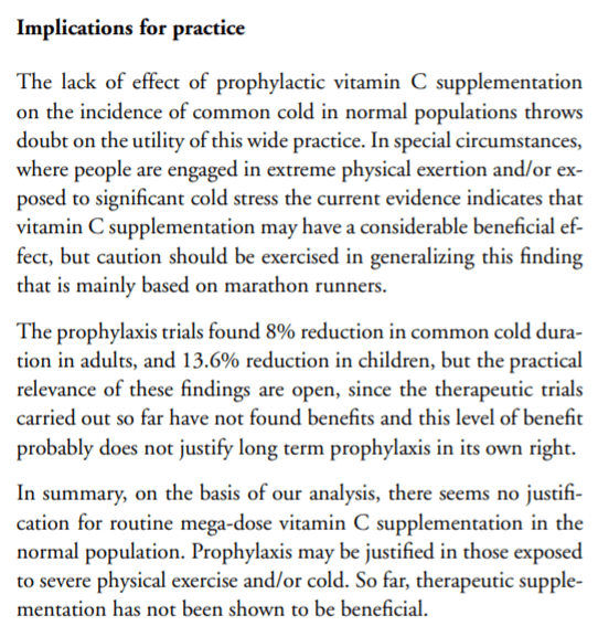 - “The lack of effect of prophylactic vitamin C supplementation on the incidence of common cold in normal populations throws doubt on the utility of this wide practice.”
